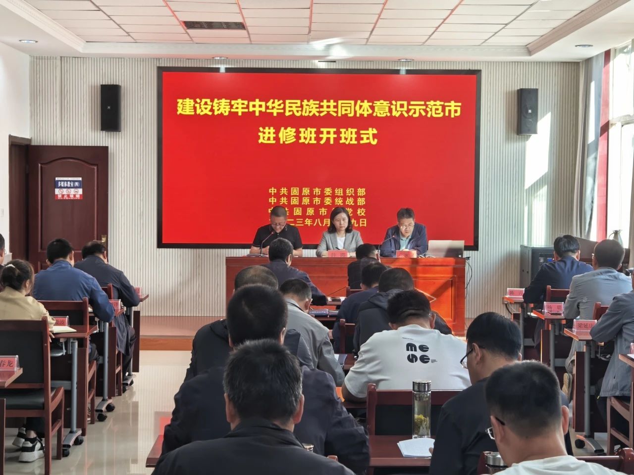 8月29日,建设“铸牢中华民族共同体意识示范市”进修班在市委党校开班。市委组织部、市委统战部、市委党校相关负责人参加开班式,市直有关部门分管领导、各县(区)党委统战部分管领导和乡镇统战委员共48名学员参加培训。