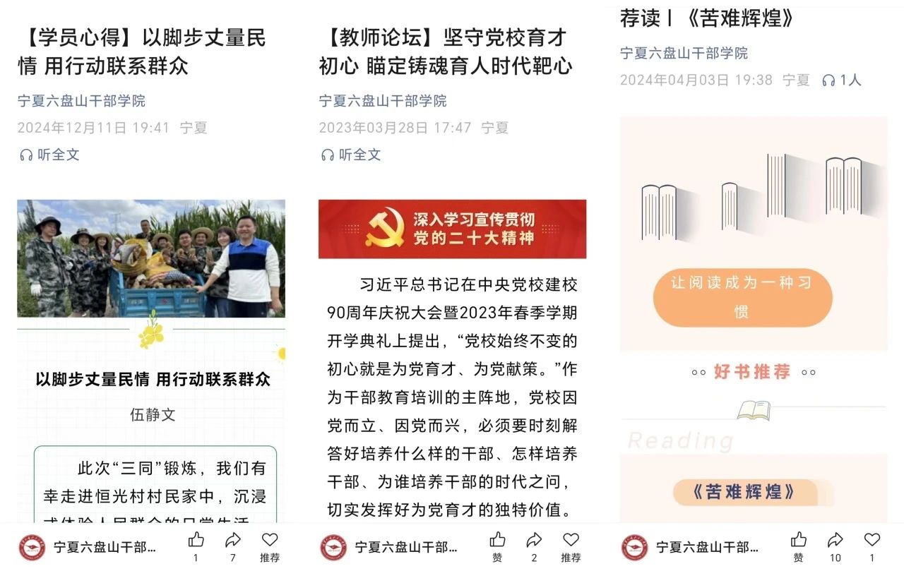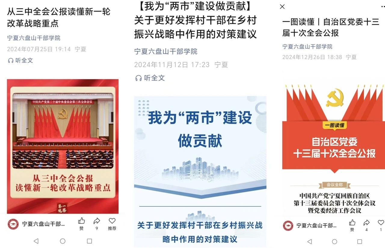 校(院)图书信息部始终坚持以习近平新时代中国特色社会主义思想为指导,坚守“为党育才、为党献策”的党校初心,切实增强“市委有部署、党校见行动”政治自觉,围绕党中央和区市党委、政府重大决策部署,及时策划推出专栏,传递党的声音。党的二十届三中全会召开后,校(院)第一时间转发《从三中全会公报读懂新一轮改革战略重点》、一图读懂《二十届三中全会<决定>提出要建立健全这些制度》等内容,引导广大干部职工、学员把思想和行动统一到全会精神上来,把智慧和力量凝聚到实现全会确定的各项目标任务上来。围绕自治区第十三次党代会提出的构建“一主一带一副”发展新格局,赋予固原市建设宁夏副中心城市和生态文旅特色市的使命任务,策划推出“我为‘两市’建设做贡献”栏目,发挥党校智库作用,为推进“两市”建设贡献智慧和力量。
