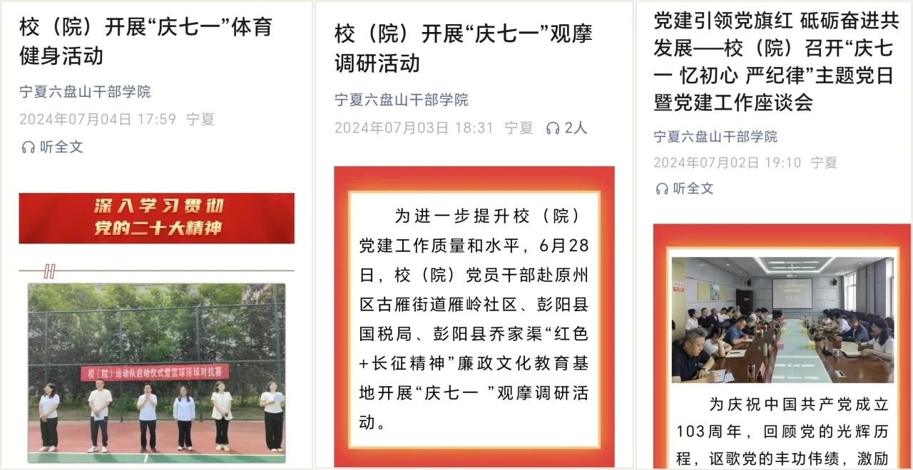 紧紧围绕校(院)主题活动策划系列报道,全方面、多形式讲好发展奋进的党校故事。如“七一”国庆节主题活动开展时,通过发布《校(院)开展“庆七一”体育健身活动》《校(院)开展“庆七一”观摩调研活动》《校(院)青年理论学习小组赴雁岭社区开展“庆七一”义务宣讲活动》等系列活动消息,图文展现活动开展的精彩瞬间。在活动结束后,发布综合报道——《校(院)开展“庆七一 忆初心 严纪律”“八个一”系列活动》,进一步总结升华活动开展的意义,激励校(院)党员干部不忘初心、砥砺前行;在第40个教师节之际,策划推出“听听他们的‘师’情话意”“一起听听党校教师的心声”等专题报道,用视频讲述的方式展现党校教师授课背后的故事以及他们对党校事业的真挚情感与美好祝愿;围绕深圳市委党校中青年干部培训班“三同”锻炼活动开设“学员心得”专栏,全面展现学员们通过沉浸式学习后对固原“老乡”的真挚情感、对党的脱贫政策的深切感悟……