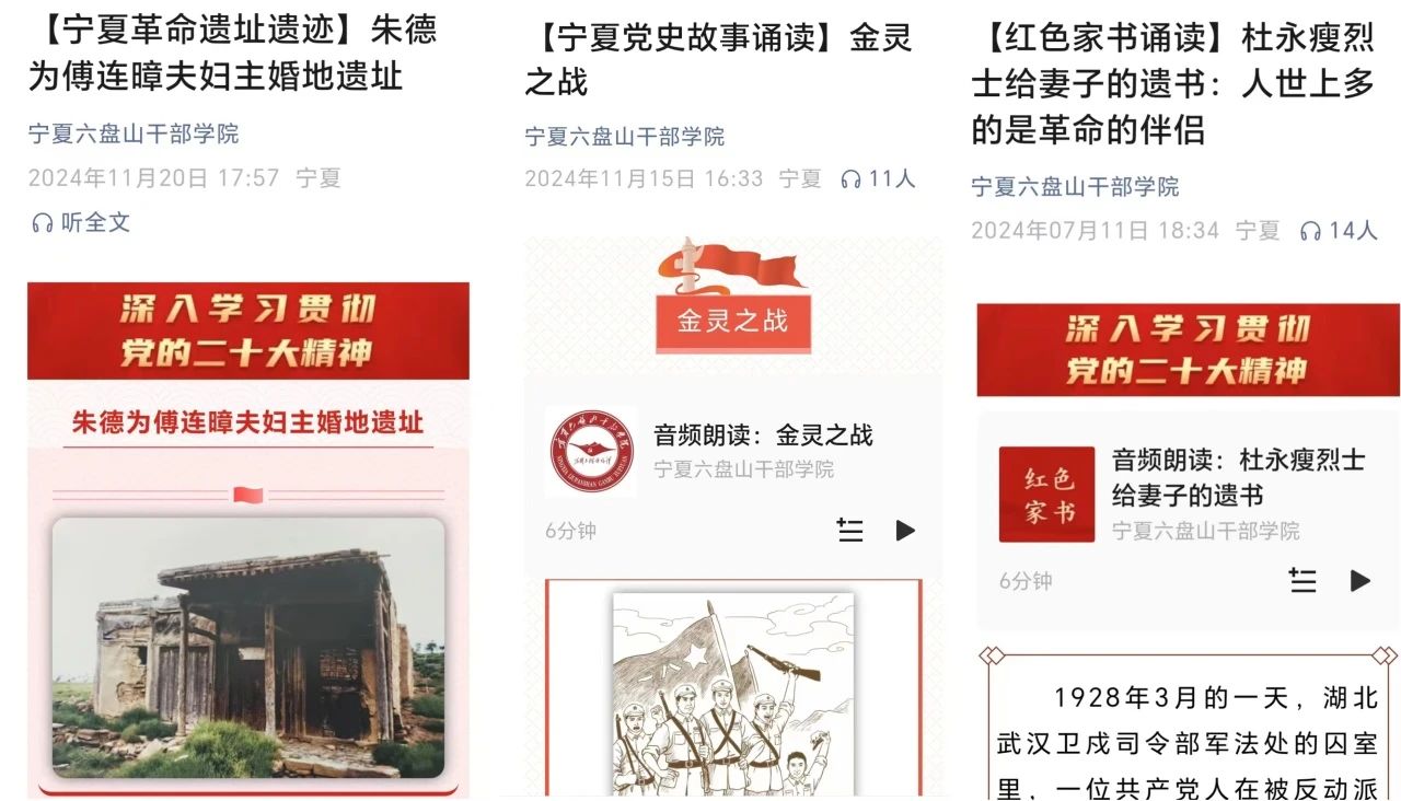 积极挖掘、整理宁夏丰富厚重的红色资源,策划开设“宁夏党史故事诵读”“宁夏革命遗址遗迹”“学党史·守初心”“红色家书诵读”等栏目,多角度、多形式“讲述”宁夏党史故事,在宣传推介好红色宁夏的同时,更教育引导广大干部群众进一步传承红色基因、筑牢信仰之基,凝聚起团结奋进的强大合力。