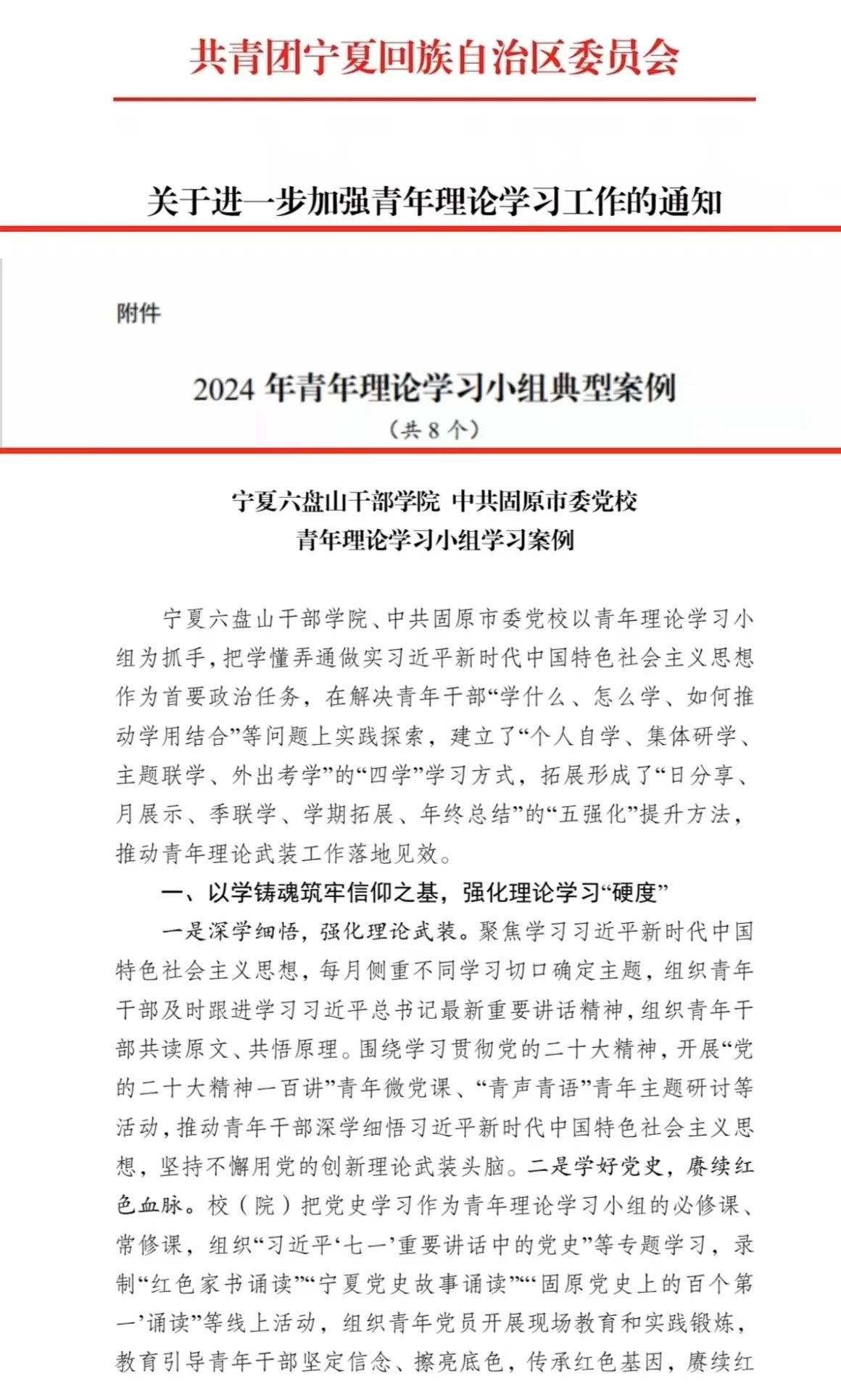 近日,共青团宁夏回族自治区委员会印发《关于进一步加强青年理论学习工作的通知》,宁夏六盘山干部学院 中共固原市委党校青年理论学习小组的经验做法成功入选2024年全区青年理论学习小组典型案例,受到通报表扬。这一可喜荣誉的获得,不仅是对校(院)青年理论学习工作的高度认可,更是激励校(院)青年干部继续奋进的强大动力。