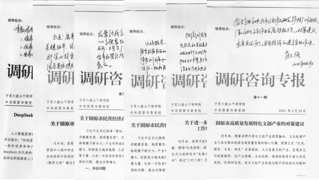 通过“市委政府点题、校(院)领题、师生答题”的方式,聚焦“两市”建设、“四色”固原等市委、政府的重点工作,精准对接决策需求,积极发挥党校为党献策的独特作用。2025年申报成功全区党校系统智库课题1项,报送的7篇《调研咨询专报》均获市委、政府领导肯定性批示,获批率达100%,批示领导人次同比增幅达42.9%。其中《固原市高质量发展特色文创产业的对策建议》等报告中的对策建议已被文广局等职能部门吸收并转化为工作实践安排,切实做到“调以务实、研以致用”。