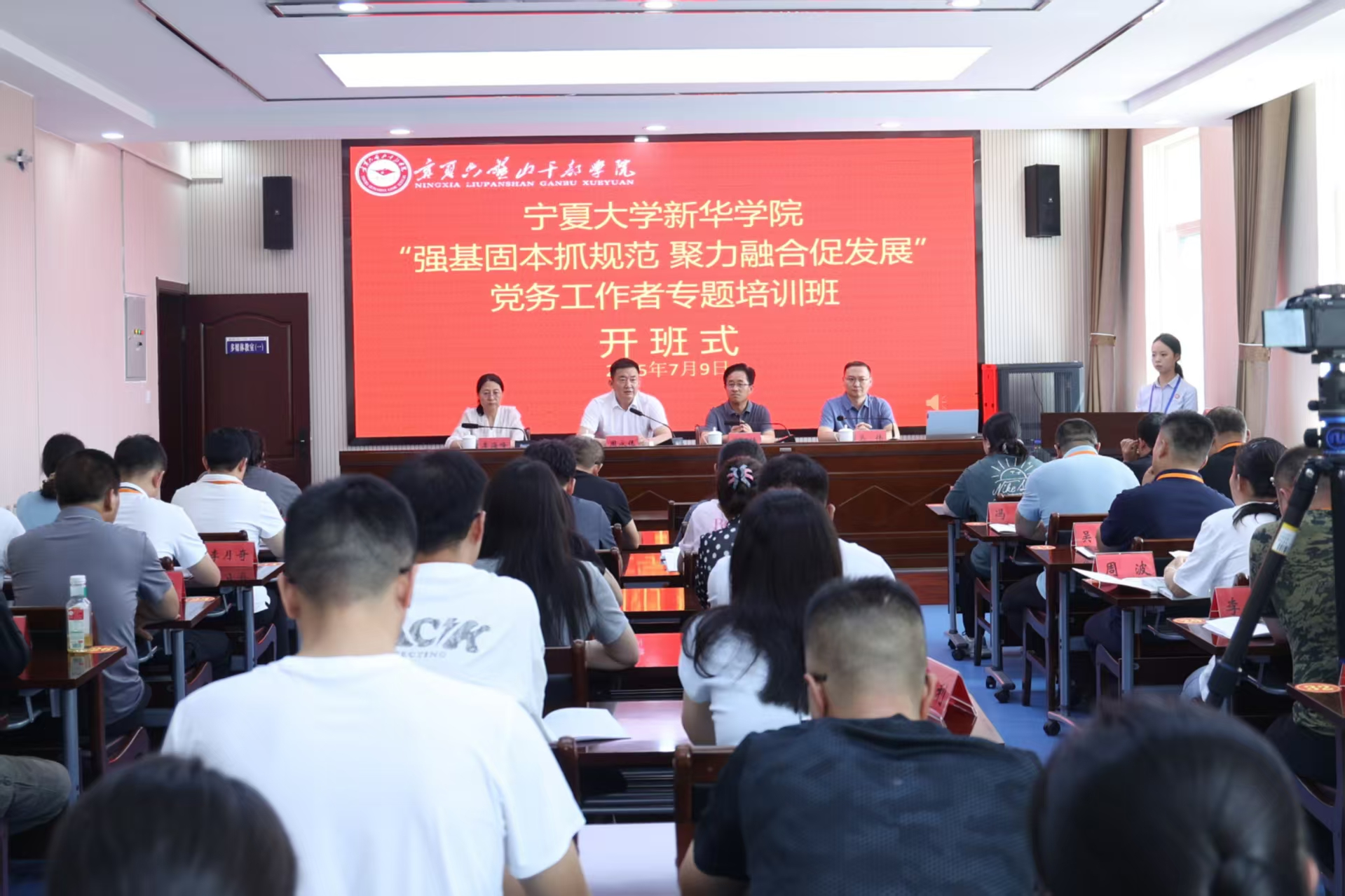 为全面提升学院党务工作队伍政治素养、履职能力与创新视野,推动党建工作与学院中心工作深度融合,7月9日下午,宁夏大学新华学院“强基固本抓规范 聚力融合促发展”党务工作者专题培训班在宁夏六盘山干部学院开班。宁夏大学新华学院党委书记、政府督导员周永伟作开班动员讲话,宁夏六盘山干部学院常务副院长徐万廷致辞并授班旗,来自宁夏大学新华学院党员干部共47人参加培训。