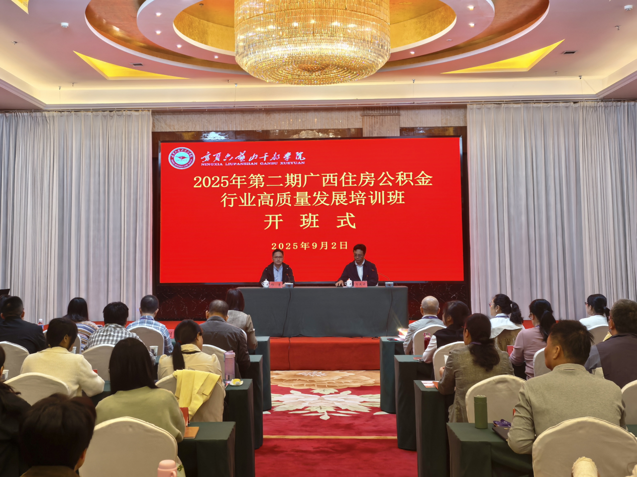 9月2日上午,2025年第二期广西住房公积金行业高质量发展培训班在宁夏六盘山干部学院开班。广西住房公积金协会秘书长邓勇出席开班式并作动员讲话,宁夏六盘山干部学院副院长马东升致辞并为培训班授班旗,来自广西住房公积金行业的70名学员参加本次培训。